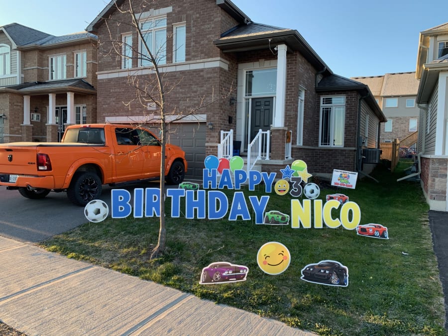 Includes the 2' letters, and a variety of colorful cars, and multiple street signs. As with any Yard Greeting, We can add the person's name on the lawn too!