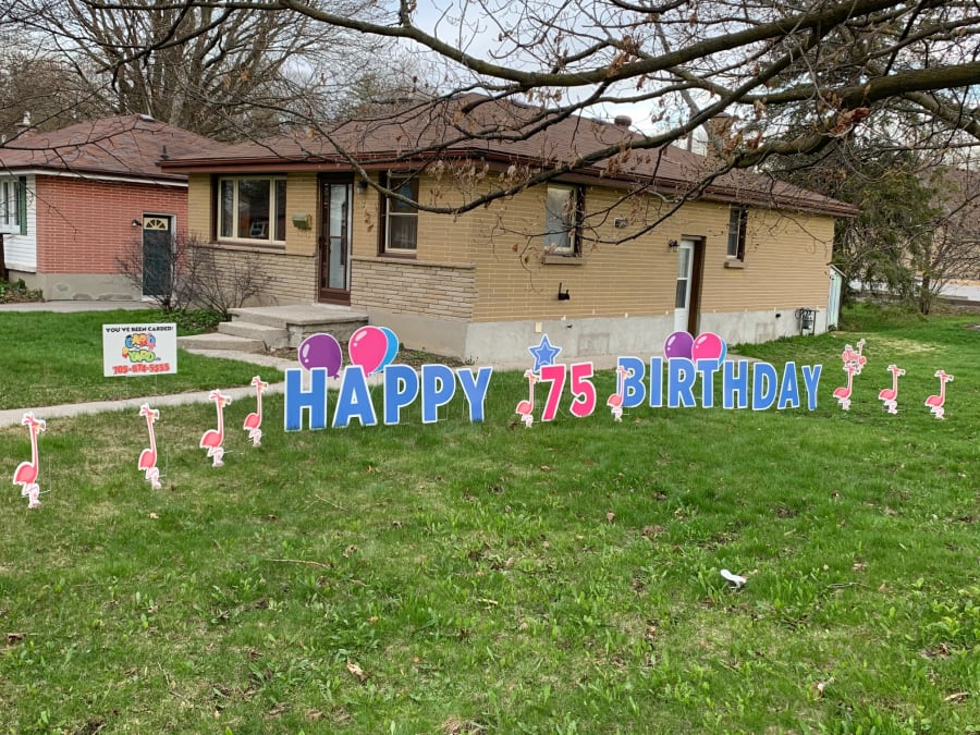 Includes the 2' letters, a variety of flamingos, and plastic balloons. As with any Yard Greeting, we can add the person's name and age on the lawn too! Also called Flamingos in the yard!