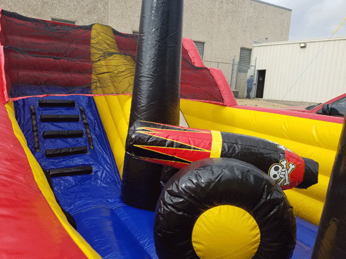 The Lil Pirates Combo Bouncer is recommended for Ages 1-5 with is size and design. It will have them plundering on the high seas in no time, in this amazing realistic inflatable pirate ship. A pair of buccaneers greets each player at the ship's entrance, and inside kids can bounce in the ample jumping area, battle through the pop-up obstacles or enjoy the climb and slide located at the stern. The combo unit boasts impressive three-dimensional artwork, with a traditional pirate skull and crossed swords at the bow and ship's flag, along with a lookout on the mast. The ship itself has a life of its own, with a sharp-toothed face on the outside bow, the Lil Pirates Combo Bouncer is sure to please any landlubber!