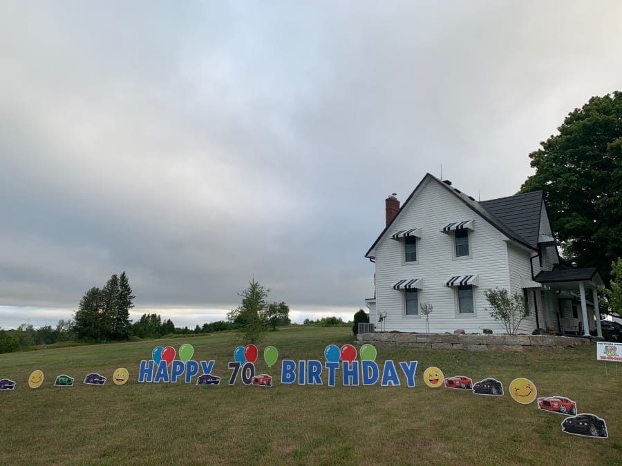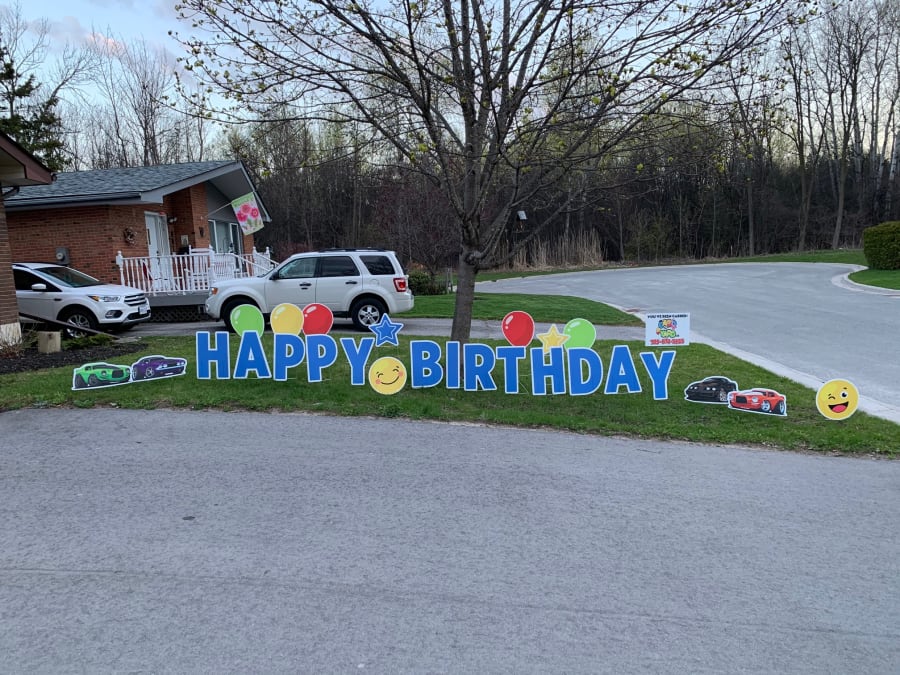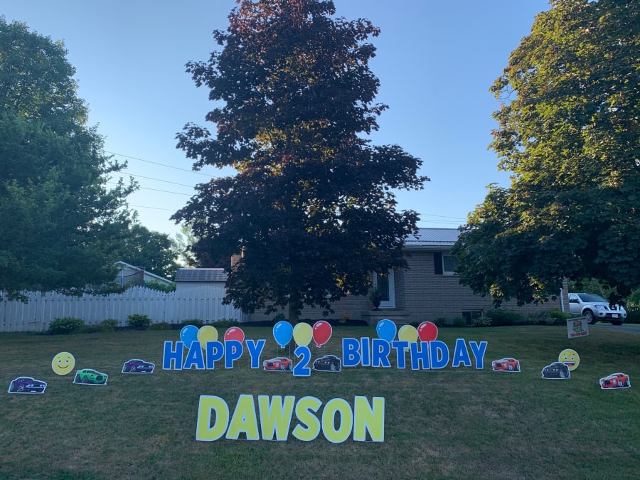 This Happy Birthday Peterborough Yard Greeting rental sign is great for all ages. We go full throttle with a variety of ways to say Happy Birthday or any other message on the lawn with these brightly colored cars. Here are a few examples: