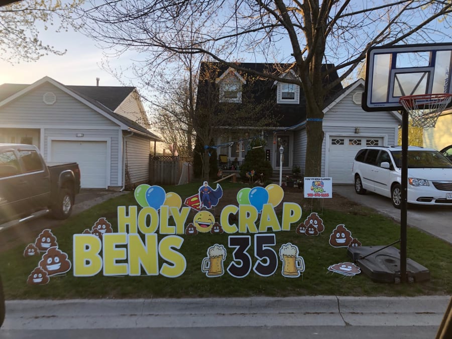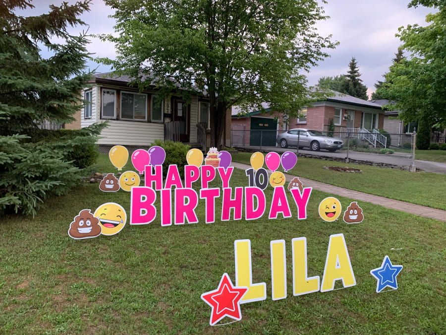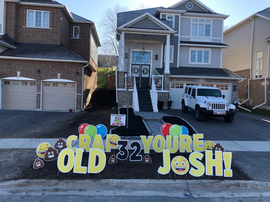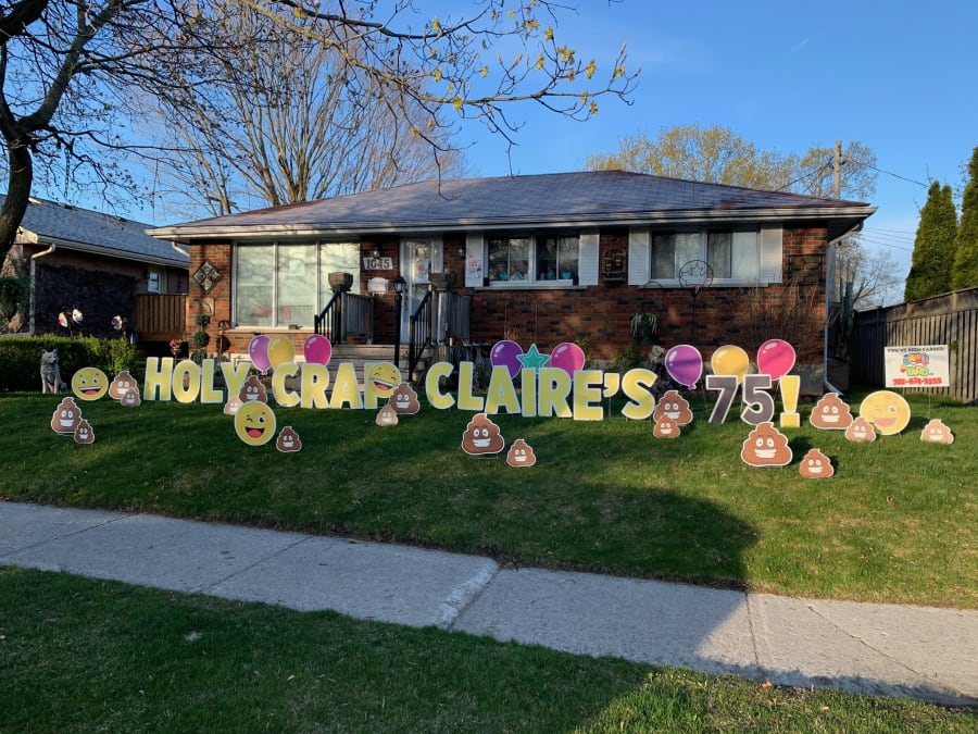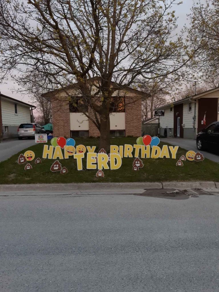 This Peterborough Yard Greeting rental sign is great for any age or any occasion. These silly poo smiley faces can be used to say Happy Birthday or say anything you wish! Here are a few examples of messages that can be displayed on the lawn: