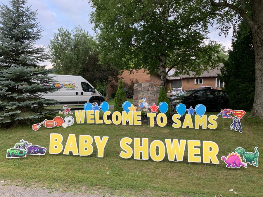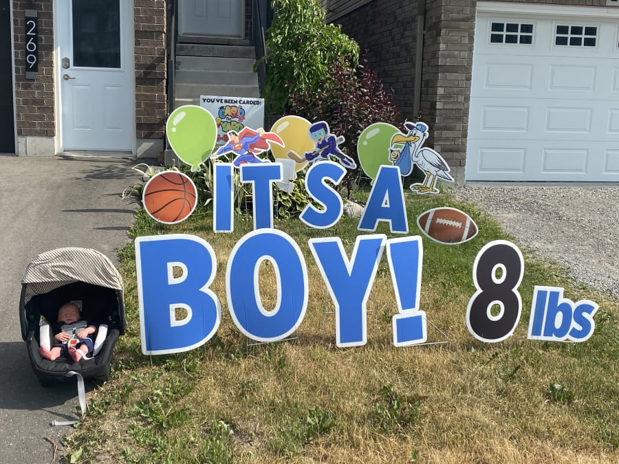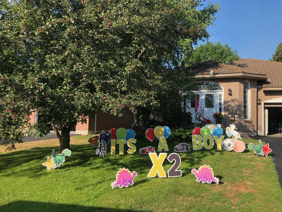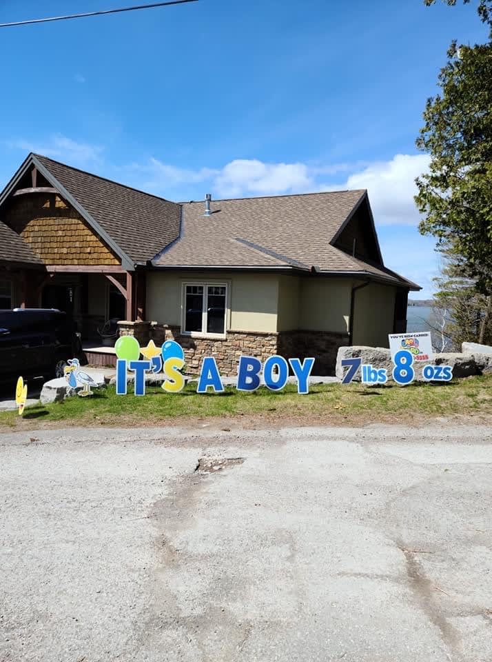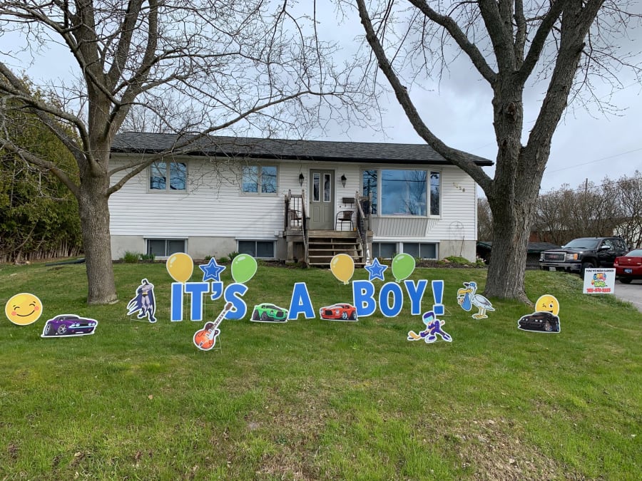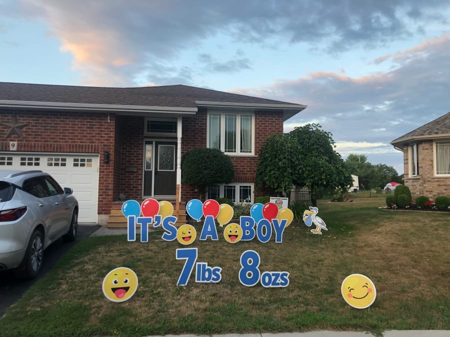 This Peterborough Yard Greeting rental sign is a great way to announce the birth of a new baby boy. You can add the baby's name* to the display on the lawn or omit the weight of the baby if you wish. A few examples of phrases to display on the lawn are: