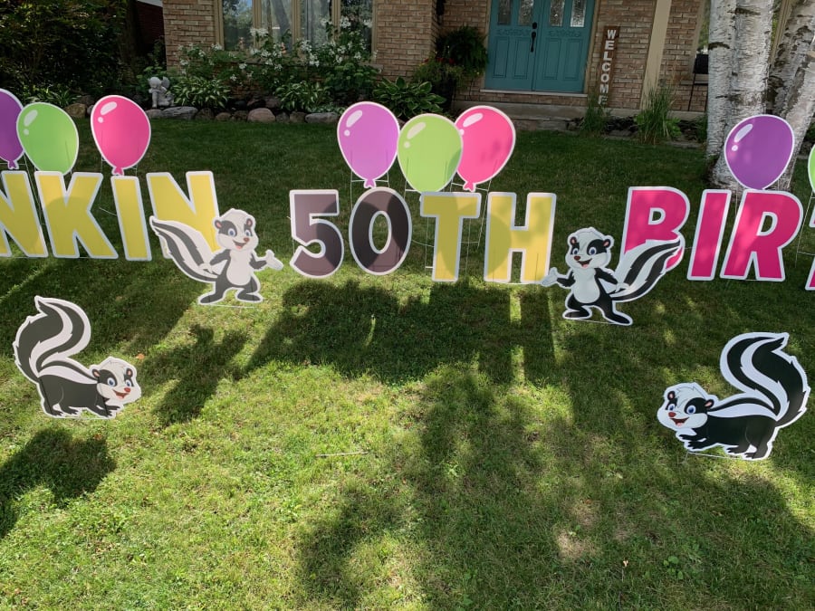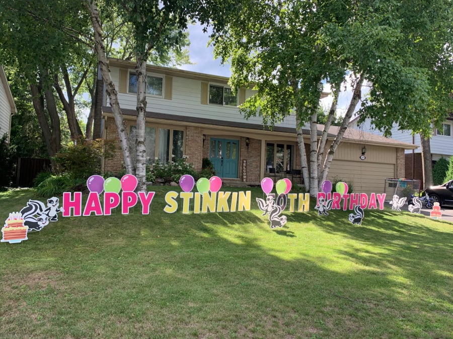 This Skunk Happy Birthday Peterborough Lawn Card rental sign is great for any age or any occasion. You can celebrate a special person in your life with a special, fun message on the lawn. These fun skunks can be used to say Happy Birthday, Happy Stinkin Birthday, Your Stinkin Old. Here are a few examples for the yard: