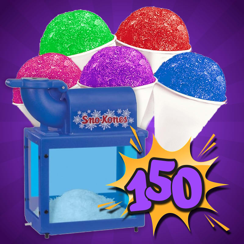 Snow Cone Machine + 150 Servings of cones and your choice of red or blue syrup, you get the ice (approx. 1.5 bags per 25 cones)