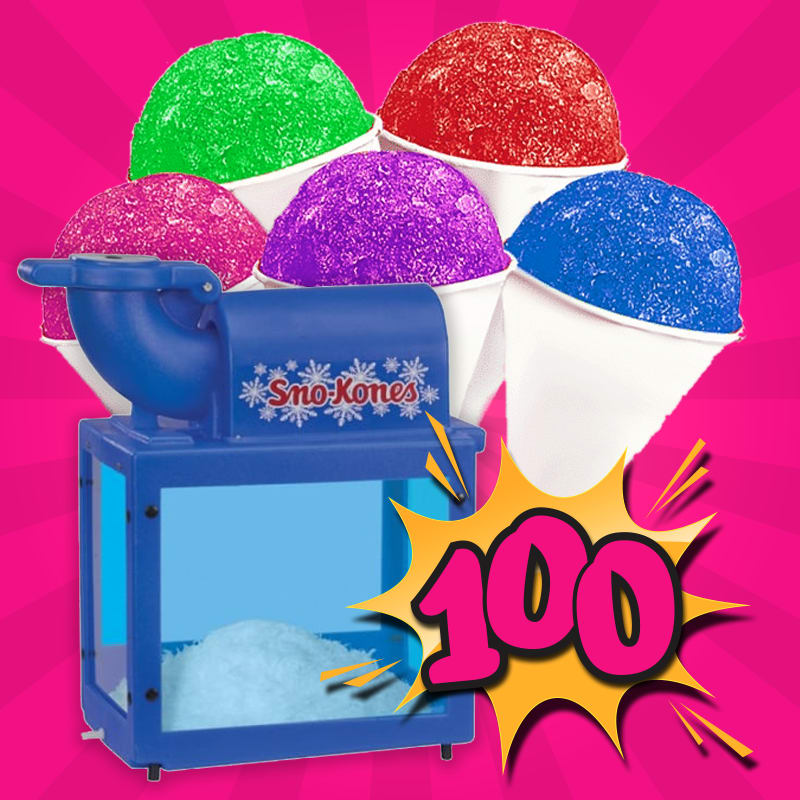 Snow Cone Machine + 100 Servings of cones and your choice of red or blue syrup, you get the ice (approx. 1.5 bags per 25 cones)