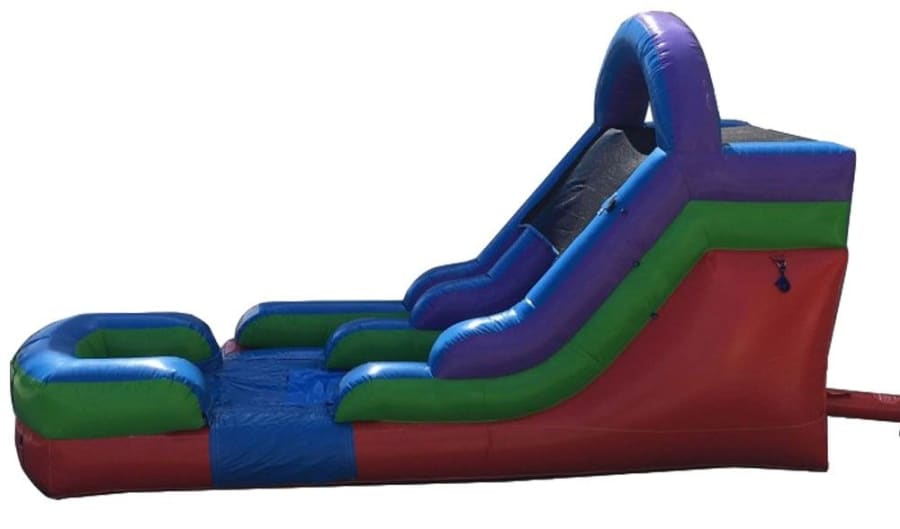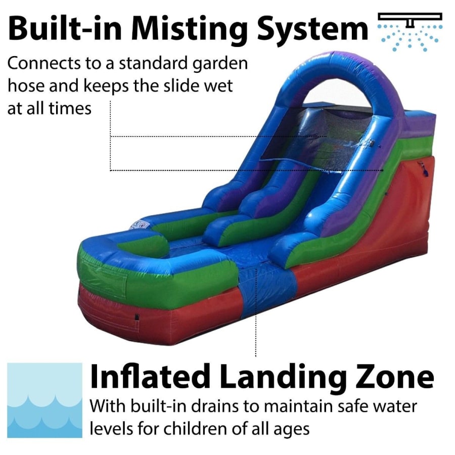 Cool off from the summer heat with the Retro Rainbow 13ft Inflatable Water Slide. Featuring a popular color scheme, Retro Rainbow, this Inflatable Water Slide in Peterborough provides fun and excitement to kids of all ages. Great for girls and boys parties. Use this slide without water on a cool day to create some big smiles or simply connect the built-in misting system to a standard garden hose on a hot day and coast into wet refreshment! All of our inflatable wet and dry slides were designed with children's safety at heart, featuring an inflated landing zone with built-in drains that keep the water level low enough for a good time, but safe enough for kids of all ages.