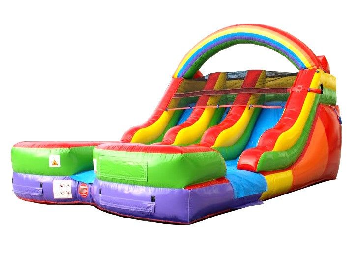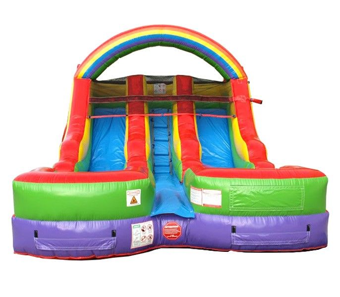 Cool off from the summer heat with the BIG Bright Double Lane 12ft Inflatable Water Slide. If one sliding lane is great, then two is twice the fun and half the wait for your next turn! This Inflatable Water Slide in Peterborough provides superior fun and excitement to kids of all ages. With its gender-neutral colors, this versatile unit can be utilized for girl and boys birthday parties. Use this slide without water on a cool day to create some big smiles or simply connect the built-in misting system to a standard garden hose on a hot day and coast down for some wet refreshment! All of our inflatable wet / dry slides were designed with children's safety at heart, featuring a double bay inflated landing zone with built-in drains that keeps the water level low enough for a good time, but safe enough for kids of all ages.